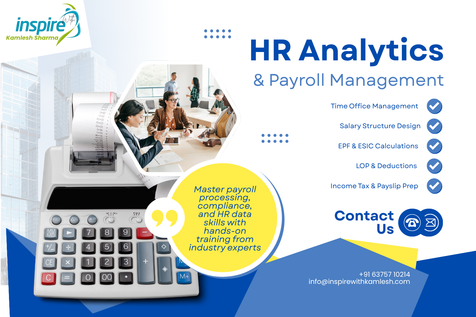 From time office management to salary structuring, EPF/ESIC calculations to income tax deductions, you’ll learn to handle the payroll cycle with accuracy and compliance while leveraging analytics to make informed HR decisions.